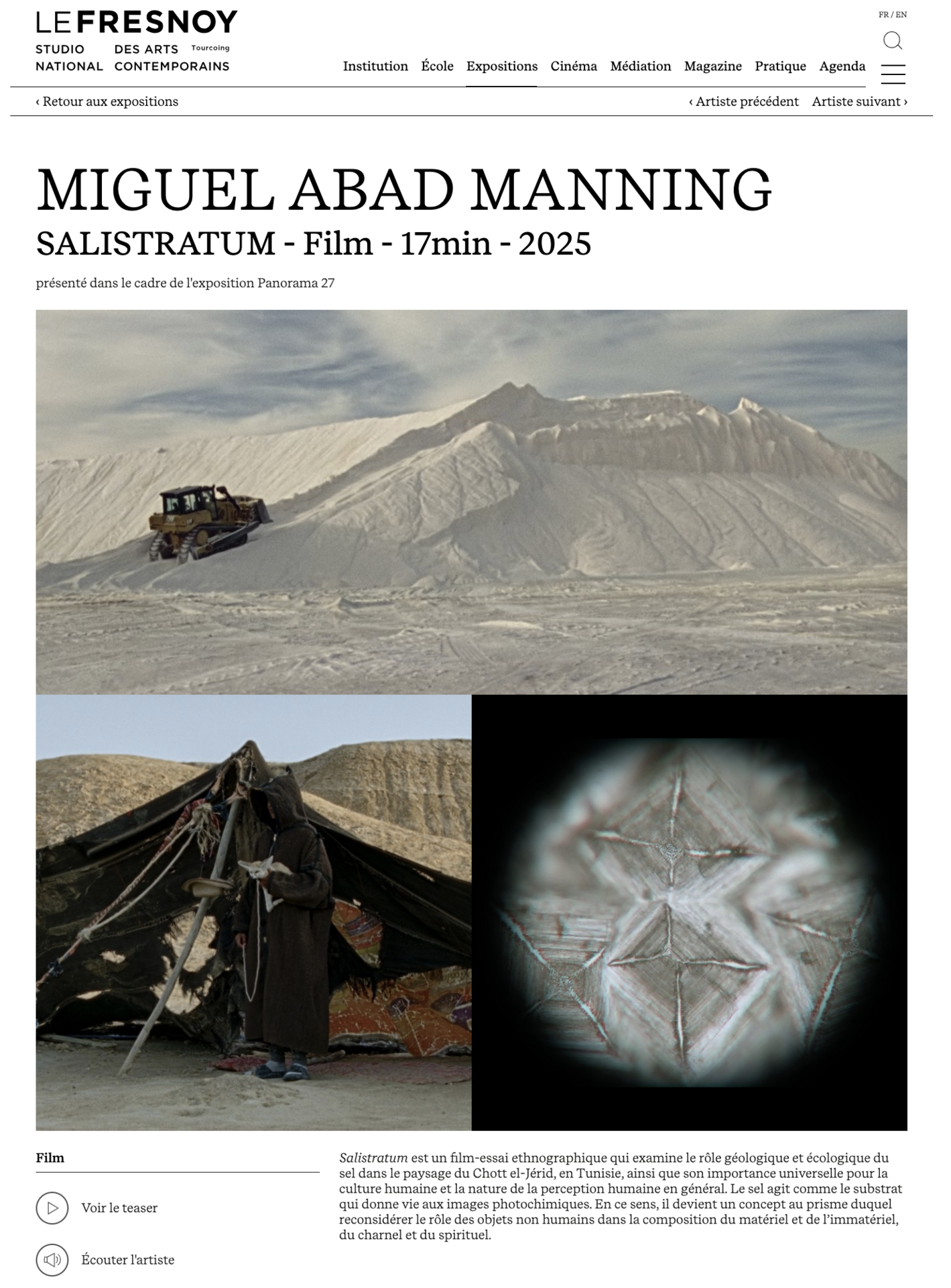 Salistratum est un projet cinématographique expérimental coproduit avec Le Fresnoy, explorant les strates de la mémoire et de l'identité. Réalisé par Miguel Abad Prendes — une œuvre poétique au croisement du documentaire et du film d'auteur.